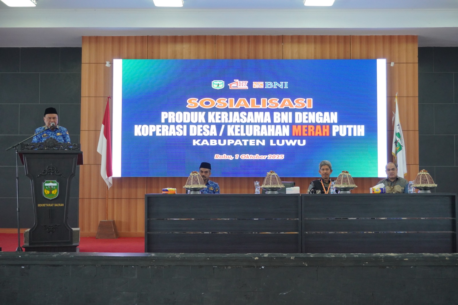 LUWU  – Pemerintah Kabupaten Luwu dalam hal ini Dinas Koperasi, UMKM dan Perindustrian bekerjasama dengan PT. Bank Negara Indonesia (BNI) menggelar Sosialisasi Produk Kerjasama BNI Dengan Koperasi Desa/Kelurahan Merah Putih di aula Andi Kambo Kompleks Perkantoran Bupati Luwu, Rabu (1/10/2025).