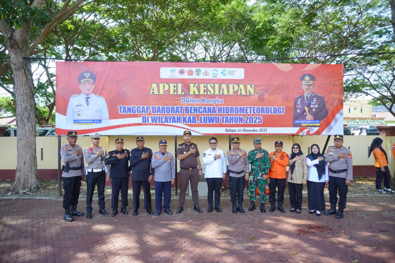 LUWU— Dalam rangka meningkatkan kesiapsiagaan menghadapi potensi bencana hidrometeorologi yang dapat terjadi pada musim penghujan, Polres Luwu menggelar Apel Kesiapsiagaan Tanggap Darurat Bencana Hidrometeorologi Kabupaten Luwu Tahun 2025, bertempat di halaman Mapolres Luwu, Rabu (5/11/2025).