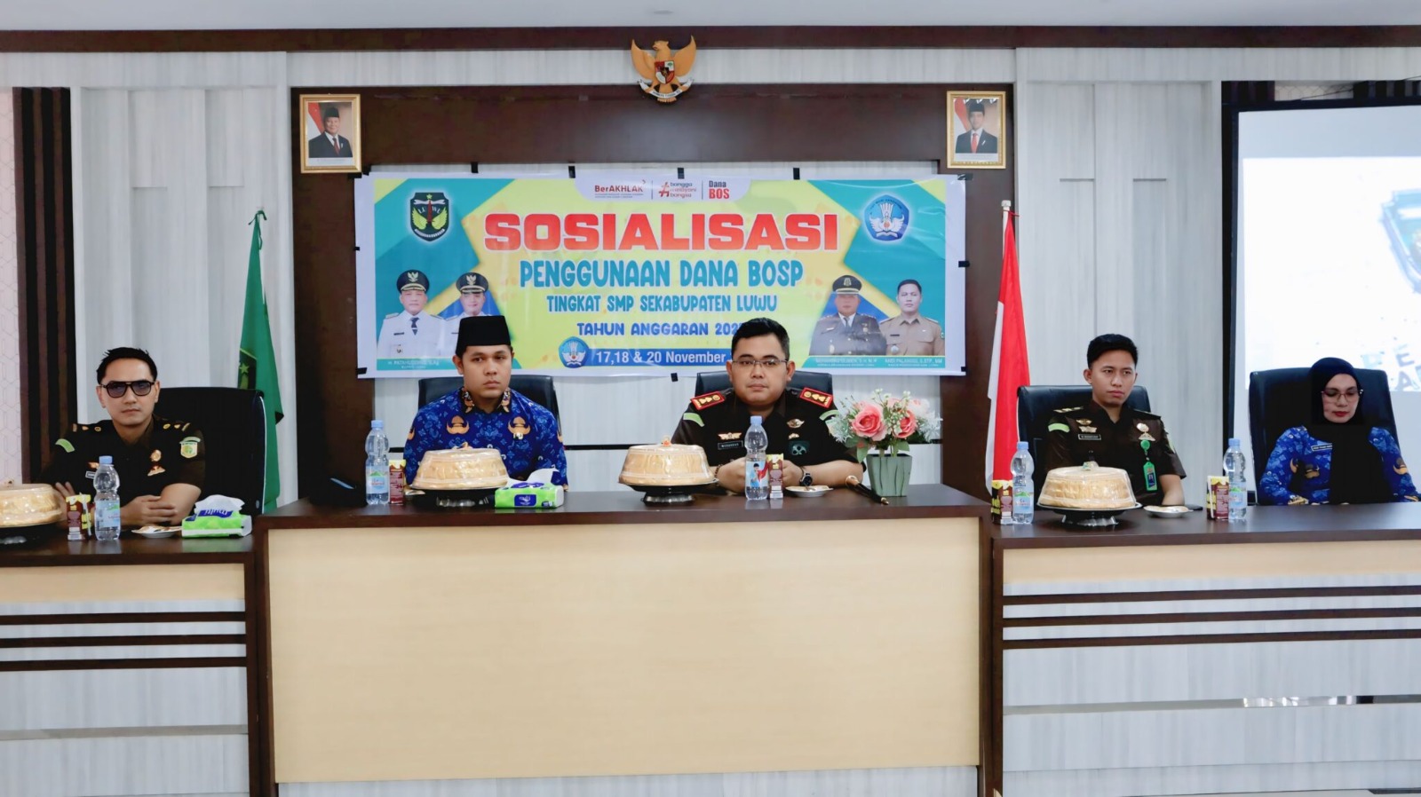 LUWU — Dinas Pendidikan Kabupaten Luwu bekerja sama dengan Kejaksaan Negeri Luwu menyelenggarakan Sosialisasi Penggunaan Dana Bantuan Operasional Satuan Pendidikan (BOSP) Tahun 2025. Kegiatan yang diikuti para kepala sekolah dan bendahara SMP se-Kabupaten Luwu ini berlangsung di Aula Kantor Kementerian Agama Kabupaten Luwu dengan tujuan meningkatkan pemahaman terkait tata kelola Dana BOSP yang transparan dan bebas dari praktik korupsi.