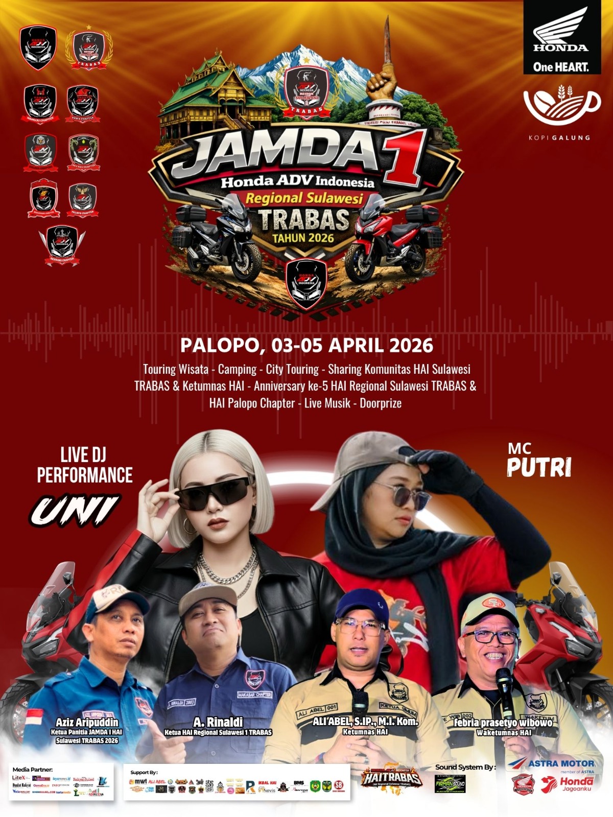 Jamda I HAI Regional Sulawesi Trabas akan diisi dengan berbagai kegiatan, antara lain camping, touring wisata budaya, sharing komunitas bikers ADV, malam selamat datang, syukuran Anniversary ke-5 HAI Palopo Chapter dan HAI Regional Sulawesi Trabas, hiburan musik, serta penampilan DJ UNI dengan MC Putri yang dikenal luas di kalangan bikers Luwu Raya.