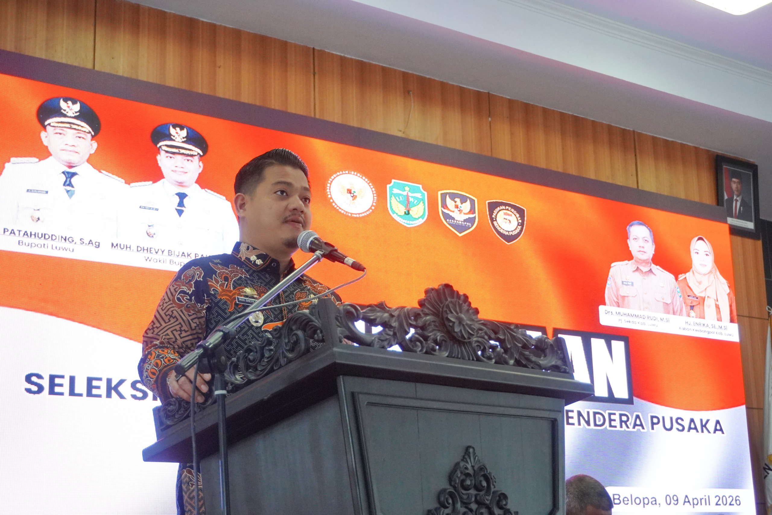 LUWU — Wakil Bupati Luwu, Muh. Dhevy Bijak Pawindu, membuka kegiatan Seleksi Calon Pasukan Pengibar Bendera Pusaka (Paskibraka) Tingkat Kabupaten Luwu Tahun 2026 di Ruang Pola Andi Kambo, Kantor Bupati Luwu, Kamis (9/4/2026).
